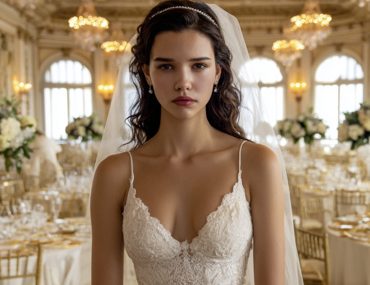 The doors flew open with a crash, and there she was on the threshold—Lera. Breathless, disheveled, a few strands fallen from her hasty updo. Her simple white dress—the one she’d guarded so carefully—was wrinkled, with an indecent blotch of dirt at the knee. She took a few unsteady steps forward, trying to catch her breath.